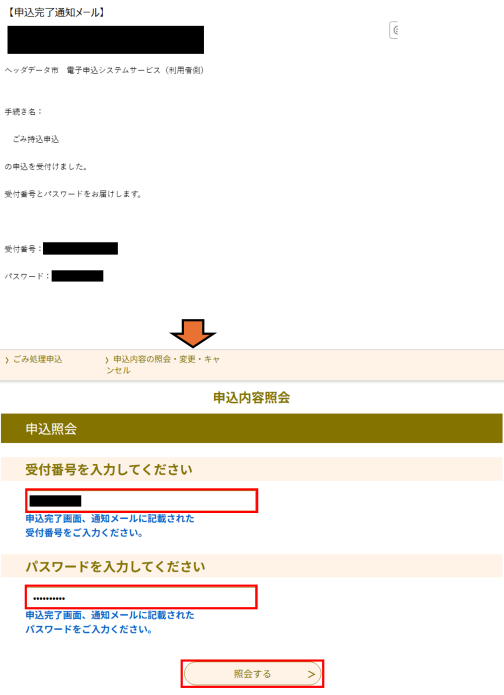 各手続きの申込が完了した際に発行された[受付番号]と[パスワード]を入力し、認証を行います。