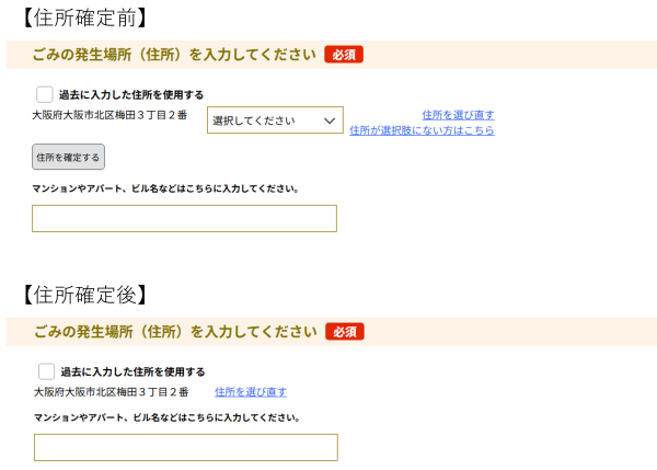 「住所を選び直す」をクリックすることで1つ前の住所選択が可能になります。