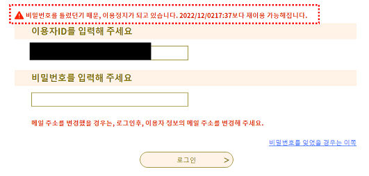 ※ 비밀번호를 규정 횟수 틀린 경우, 이용이 정지되므로 주의해 주십시오.
